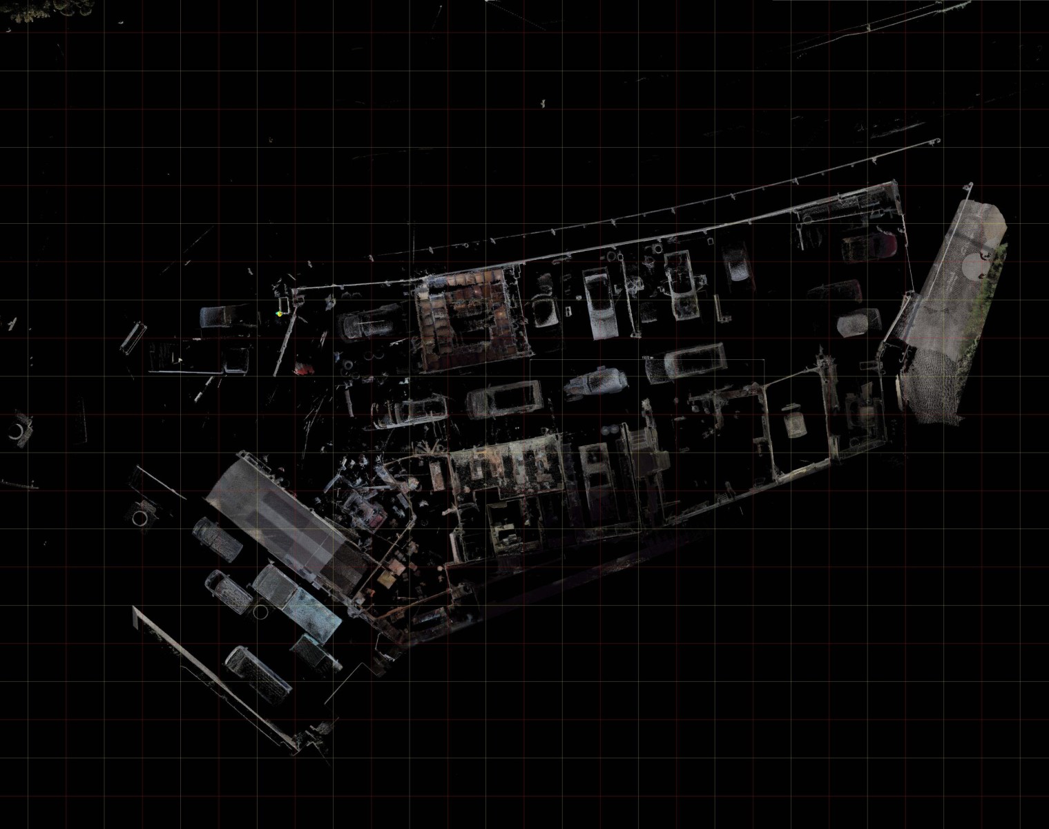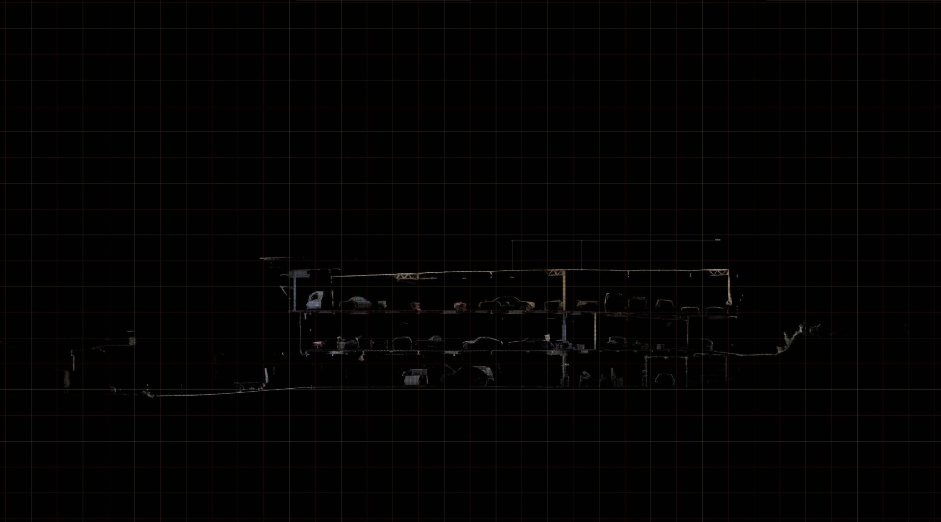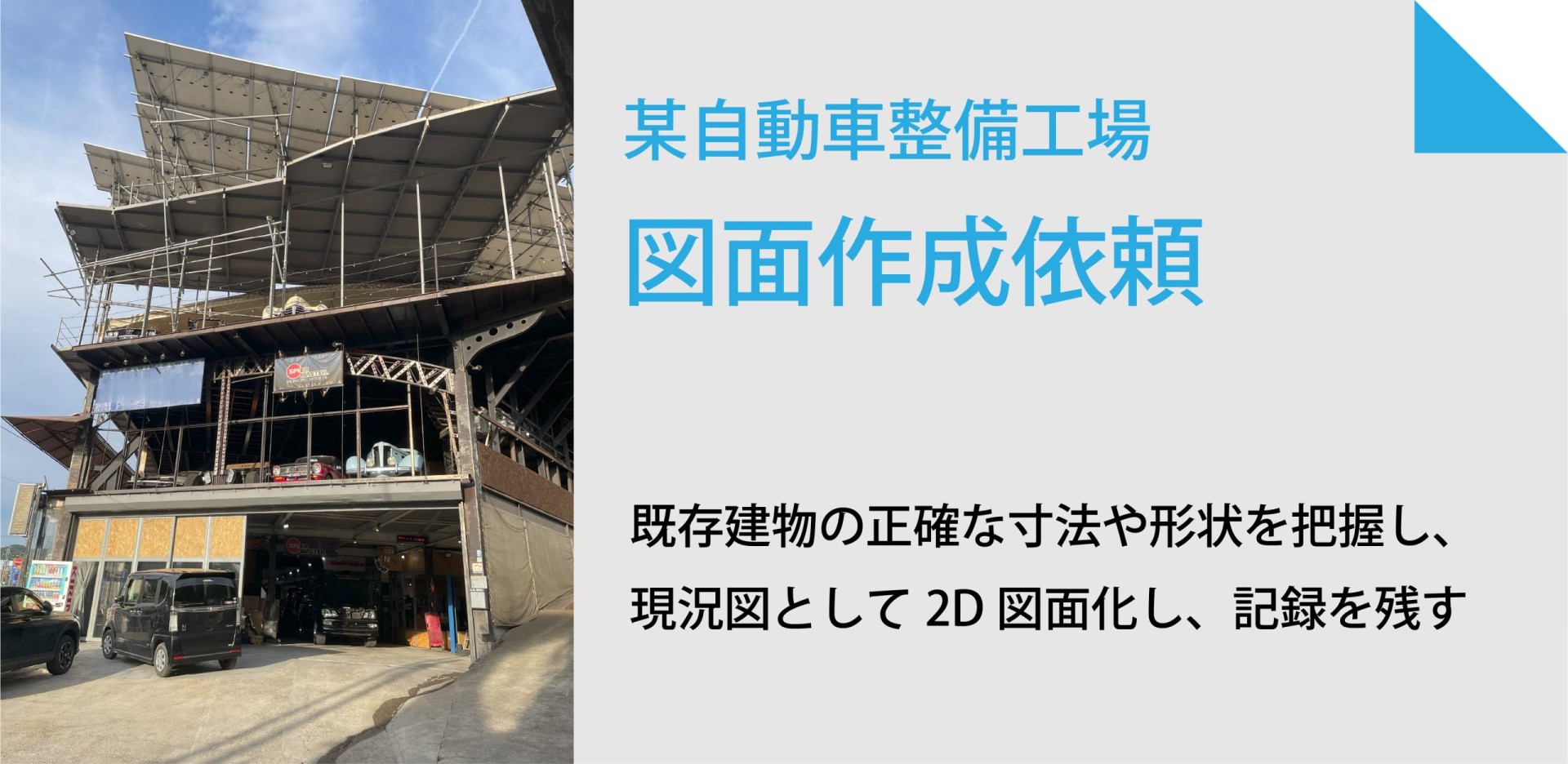 建物外観を測量するため、また図面化するために据え置き型の精度が必要なためと、建物内に多くの車、資材があり、柱などの主要部を測量するにも死角になる箇所が多くなると推定し、据え置き型のみの測量になると、作業日数が増えてしまい、結果的に金額が高くなってしまうため、主に建物外の測量として据え置き型、屋内の測量用としてハンディー型、合計2台による測量に決めました。